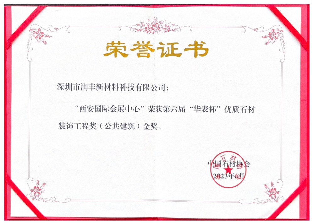 5月6日,华润建材科技旗下深圳市润丰新材料科技有限公司申报的西安国际会展中心项目荣获第六届“华表杯”优质石材装饰工程奖评比金奖,这是人造石企业第一次荣获“华表杯”奖项。