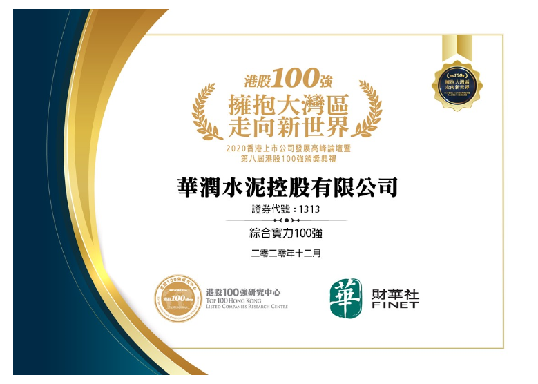 12月21日,“2020香港上市公司发展高峰论坛暨第八届港股100强颁奖典礼”在香港举行。华润水泥成功入围港股“综合实力100强”榜单,排名第72位,反映了来自金融、商业、法律等领域的专业评审,对华润水泥发展成效及投资价值的认可。